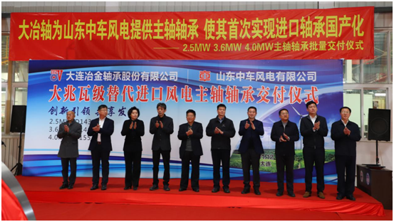2019-11-1511月12日,大连冶金轴承股份有限公司向山东中车风电有限公司交付大兆瓦级风电主轴轴承仪式在大冶轴风电转盘公司隆重举行。大兆瓦级风电主轴轴承成功批量交付是大冶轴风电转盘生产技术改革创新的又一成果,是打破外资品牌垄断、实现进口产品替代又一重拳,更是以大冶轴为代表的中国制造逐渐被国际高端市场认知和认可的又一佳绩。市委书记蹇骞、市长周振雷等政府领导出席交付仪式。
