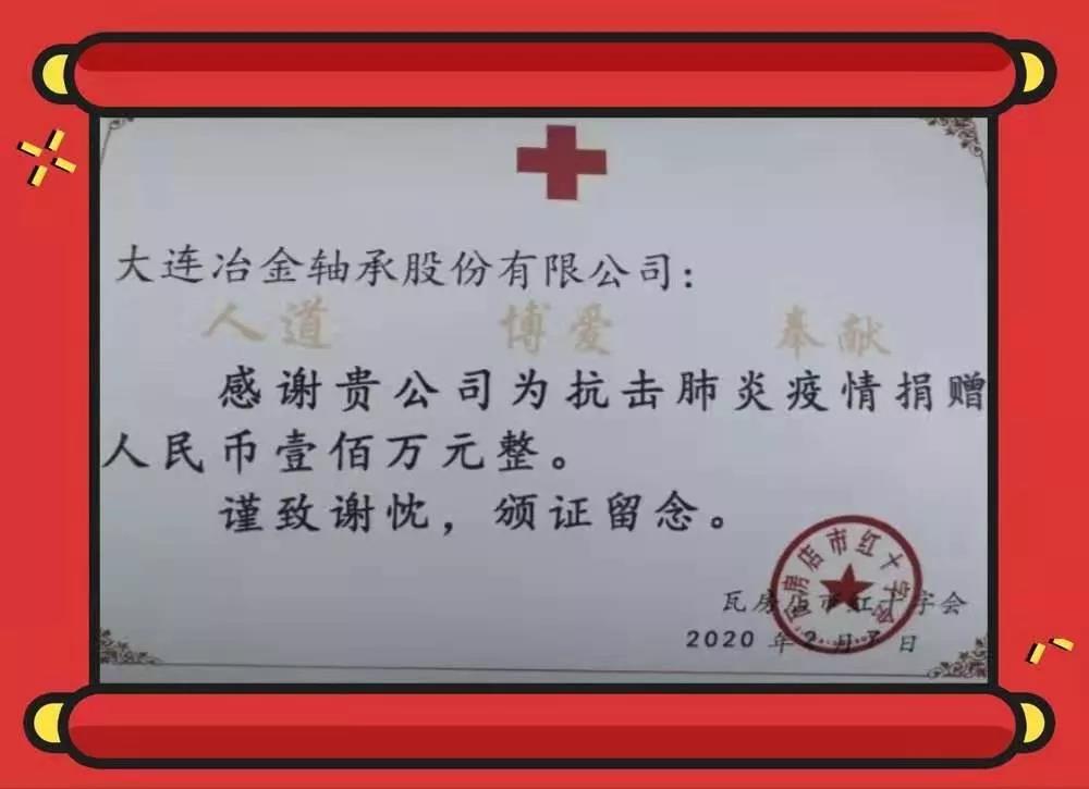 风雨同舟,披荆斩棘。“新型冠状病毒感染肺炎”疫情严峻,牵动着每一位国人的心,也激发起凝聚万众一心的磅礴力量。作为瓦房店轴承民营企业之首的大连冶金轴承股份有限公司(简称"大冶轴")也全力以赴投入到这场战役中。